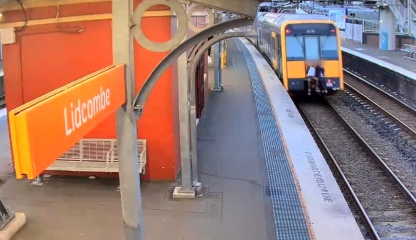 Shocking CCTV footage from January shows two people climbing on to the back of a train at Lidcombe, moments before it drives off and passes through Flemington Station on its way to the city.